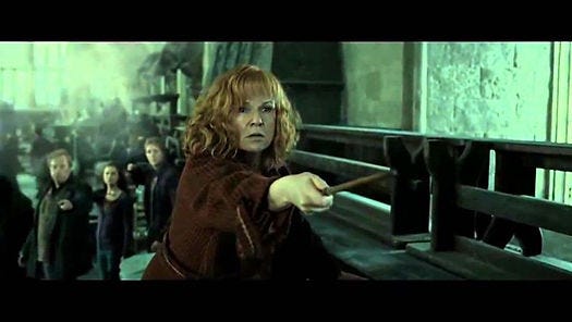 I originally wrote this post on Mother’s Day in 2016, and I thought long and hard then about which fictional mother I would consider my favorite. There are certainly a lot of possibilities, and the matter is open to all sorts of debate, but I kept coming back to the grand dame of the Burrow, the Harry Potter materfamilias who raised six boys (including, somehow, Fred and George) and a girl (and, at times, Harry, too) and did it all on a government salary. Molly embodies all the criteria of many great mothers: boundless and unconditional love, an open heart for the friends of her children, patience for shenanigans to a certain point after which stern comeuppance is delivered, tolerant affection for a sophomoric husband who at times might as well be another child, and a fierce protective devotion manifesting as righteous retribution for any who would dare to hurt her brood.
