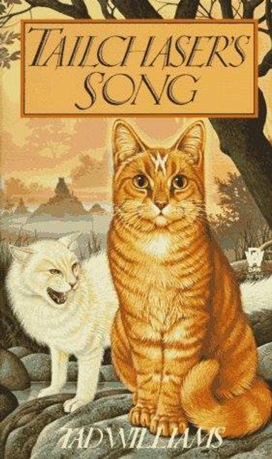 Tad Williams is a well-known fantasy author, but my favorite of his catalogue is his first novel, the strange, complex cat story Tailchaser's Song. Williams is channeling Tolkien here, inventing an entire world, language, folklore, and layered history, but he's doing it with cats. His feline protagonists are intelligent, self-aware creatures, considering themselves as the primary species on the planet and the center of the universe (as cats are wont to do). These are feral cats, not house cats, and they harbor a certain disdain and disquiet for their unnatural, odd-smelling, domesticated brethren, and a hearty fear of the furless M'an.