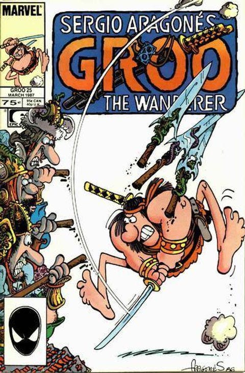 Groo wanders the landscape in search of food, women, and glory, and despite (sometimes due to) his enormous shortcomings as an adventurer, he frequently finds all three. But Groo is not destined for lasting happiness or success, and he always manages to show that he is not ept. Inhabiting a world packed with Aragone's trademark lushness, peopled with weary bimbos and snide minstrels, Groo stumbles from one mishap to the next, bringing down empires and religions and the general intelligence of the reader. It's utterly insipid, delightful stuff. I highly recommend it.